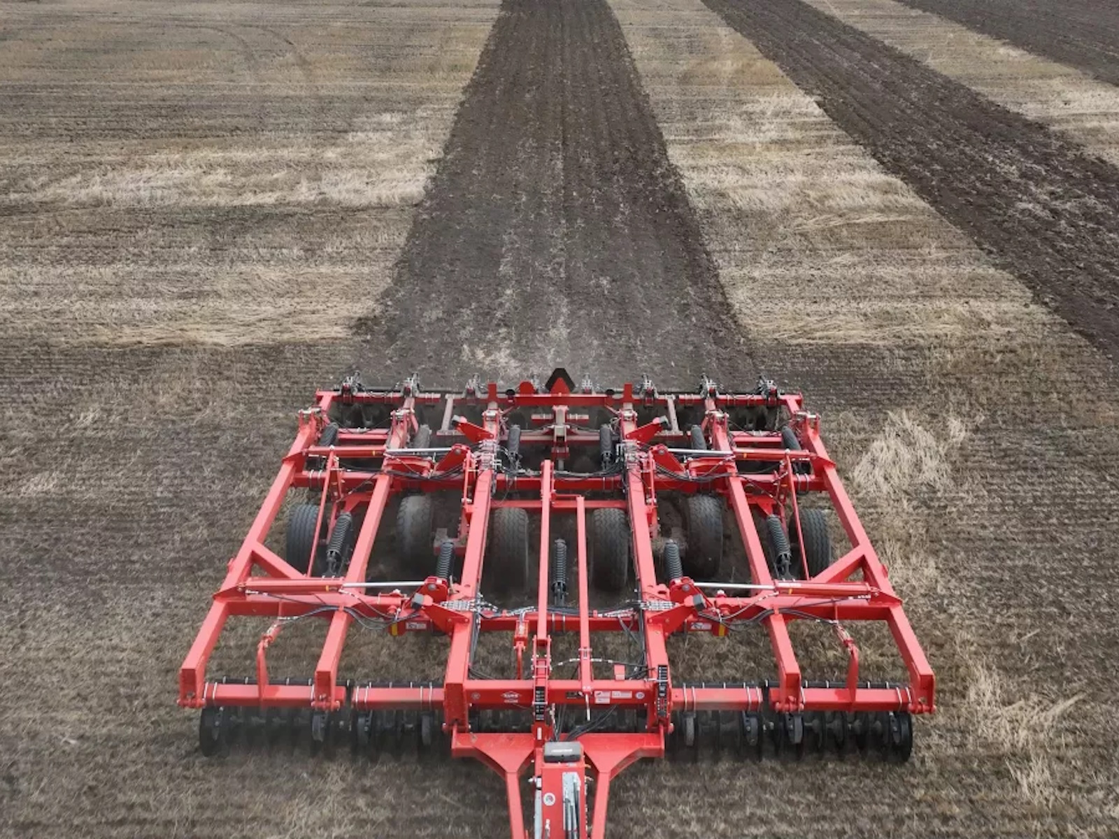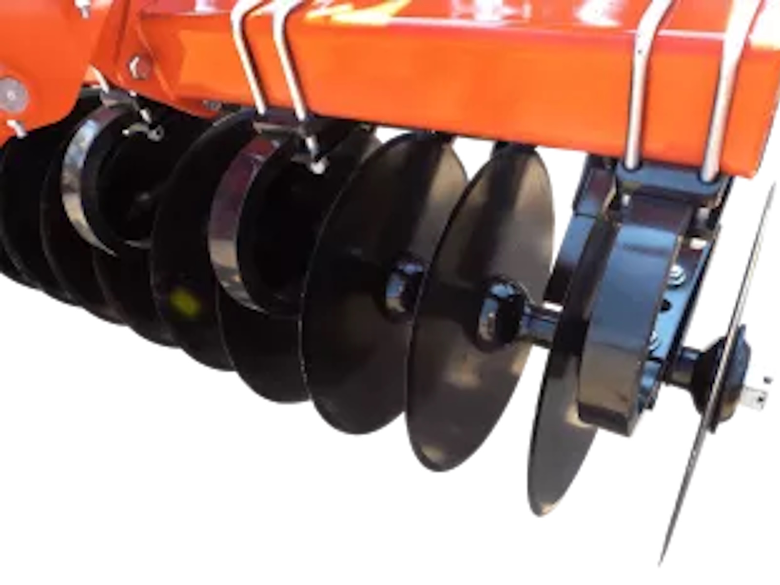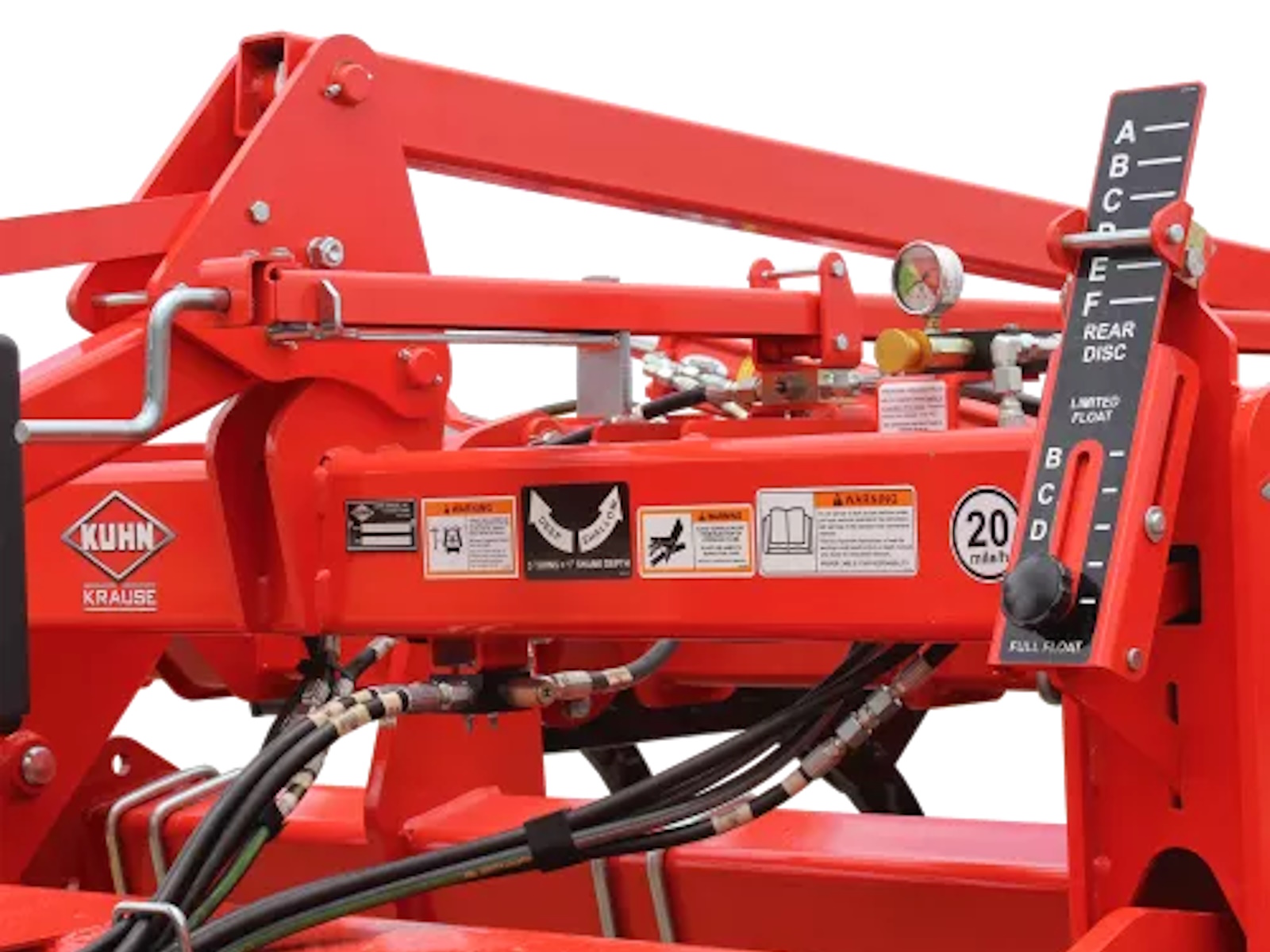 Left and right sections of the rear disc conditioner are configured in a reverse tandem design that first moves soil inward, then outward in opposite directions, to aggressively mix and bury residue, size large clods and level the soil. The disc conditioner is hydraulically controlled with a lower limit adjustment valve. Uniform 12” spacing is maintained with individually mounted, 24” fluted, shallow concavity blades. Disc conditioner blade configuration offers a level field finish while functioning within a wide range of operating speeds. A specially designed C-arm now allows for the disc hub to be directly mounted. This new combination of C-arm and hub provides 10% more soil and residue flow through the disc conditioner to improve continuous operation in adverse conditions. Dual hydraulic cylinders control the position of the rear disc conditioner for optimal operating height in relation to the tilled soil surface.