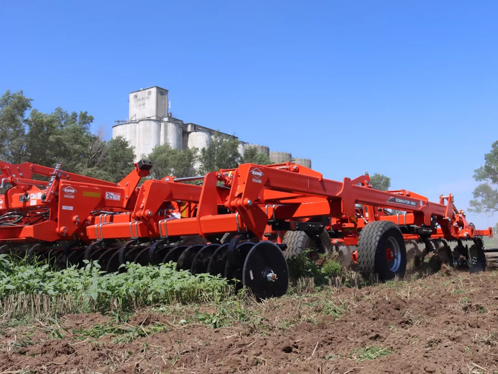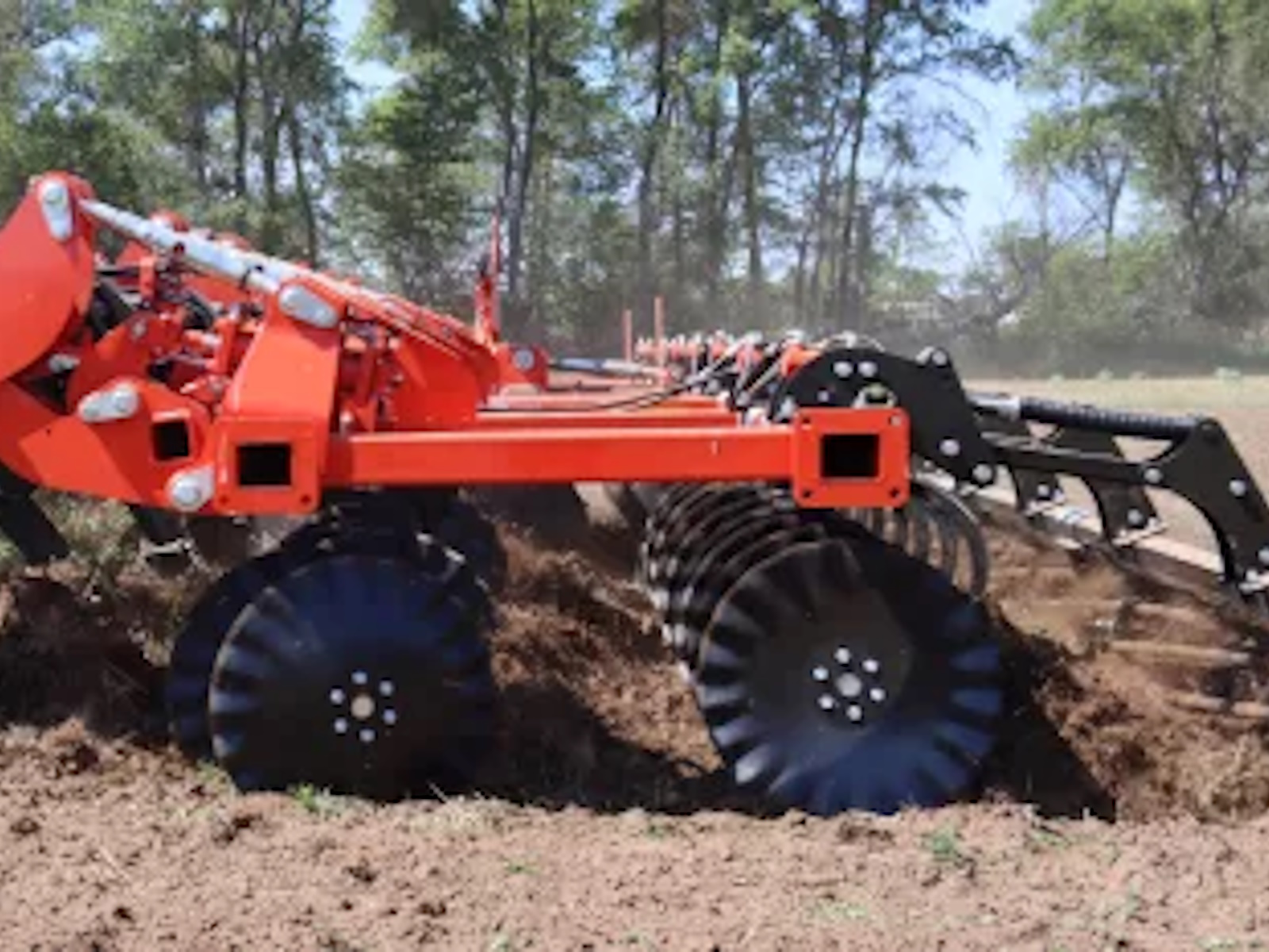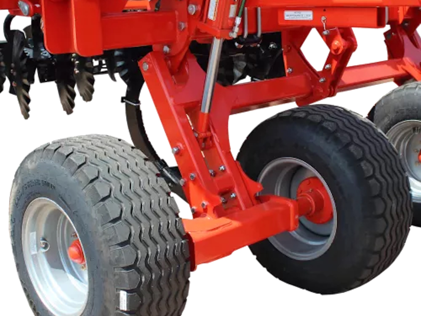 Left and right sections of the rear disc conditioner are configured in a reverse tandem design that first moves soil inward, then outward in opposite directions, to aggressively mix and bury residue, size large clods and level the soil. The disc conditioner is hydraulically controlled with a lower limit adjustment valve. Uniform 12” spacing is maintained with individually mounted, 24” fluted, shallow concavity blades. Disc conditioner blade configuration offers a level field finish while functioning within a wide range of operating speeds. A specially designed C-arm now allows for the disc hub to be directly mounted. This new combination of C-arm and hub provides 10% more soil and residue flow through the disc conditioner to improve continuous operation in adverse conditions. Dual hydraulic cylinders control the position of the rear disc conditioner for optimal operating height in relation to the tilled soil surface.