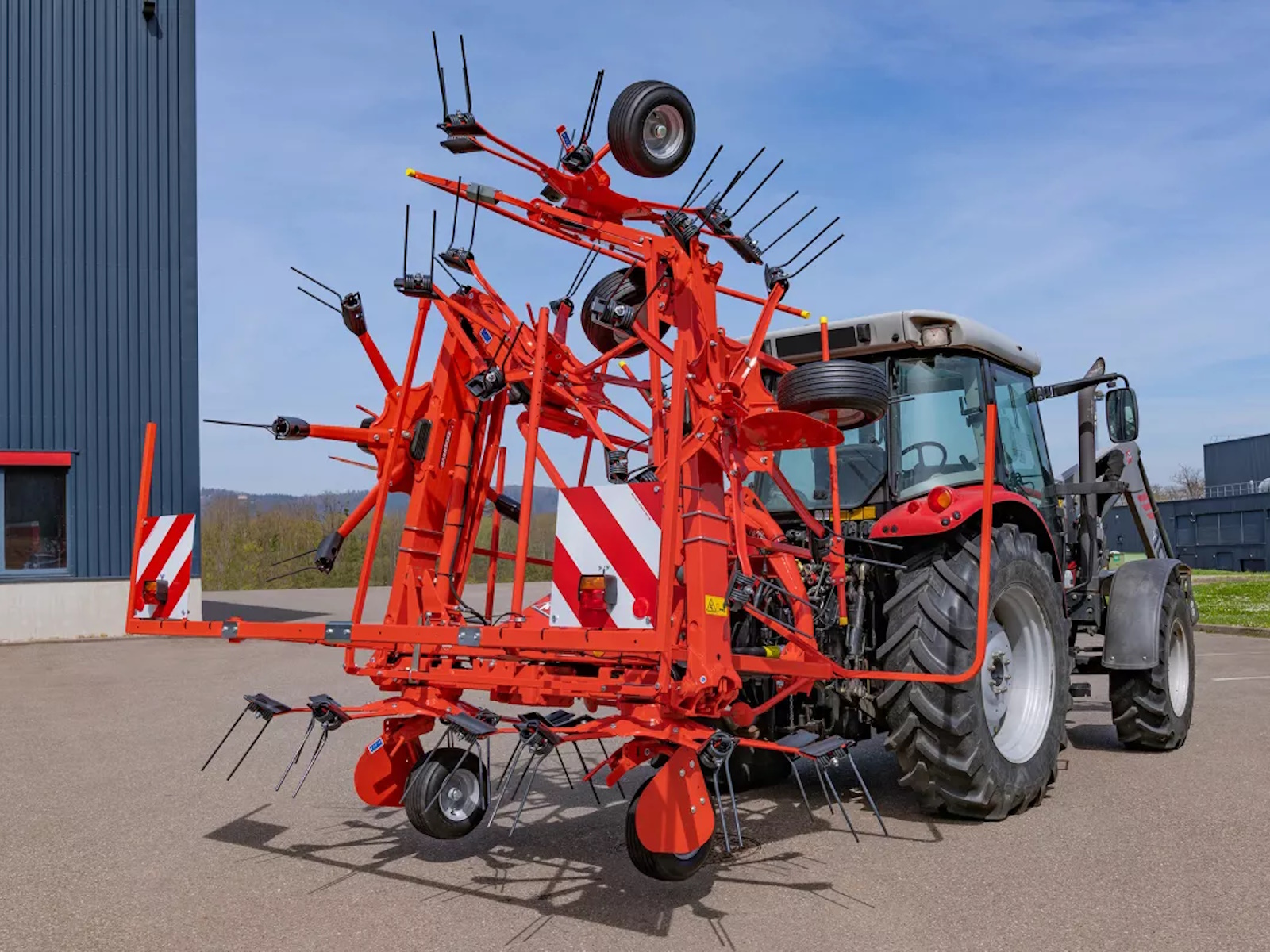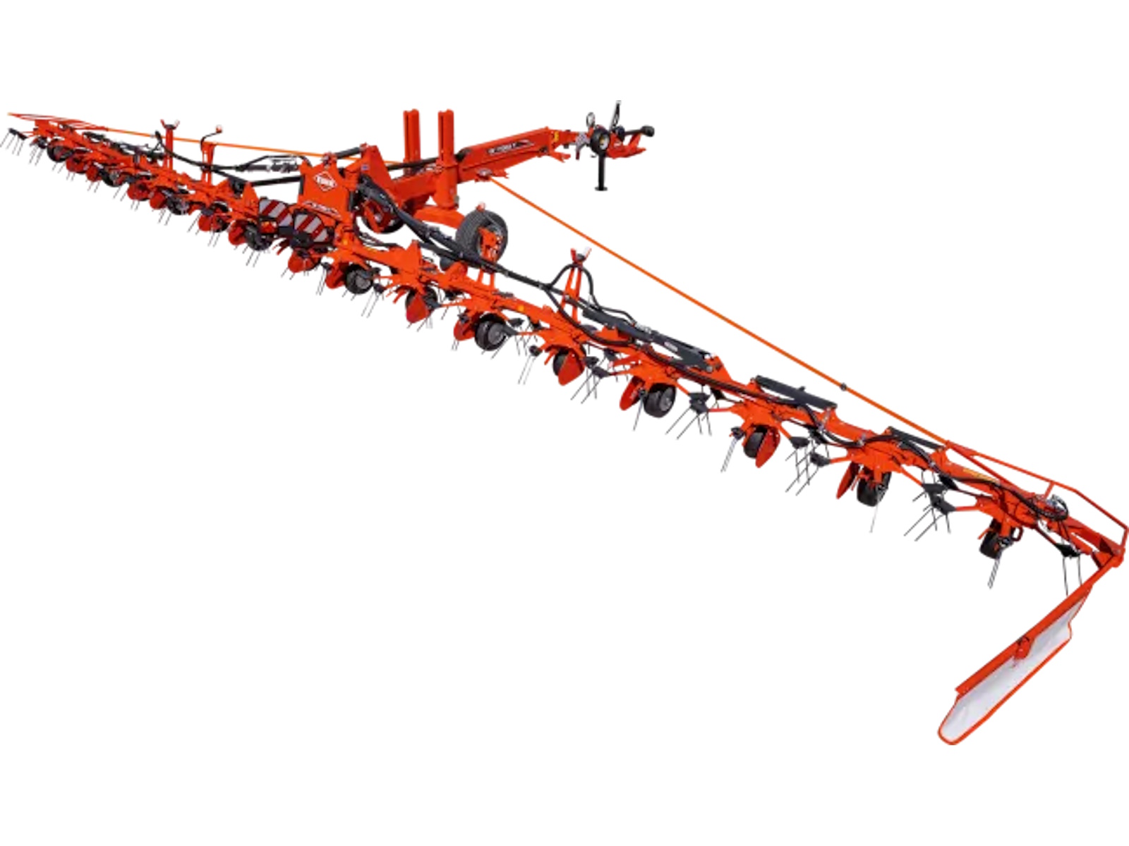 The folding system allows the transport wheels to lower and combine with the rotors tilting forward. While in transport position, height is reduced, load distribution on the tractors is optimal and road transport at high speeds is ideal. The incredibly narrow transport width and the wide transport undercarriage combine for easy maneuverability and stable road transport.
