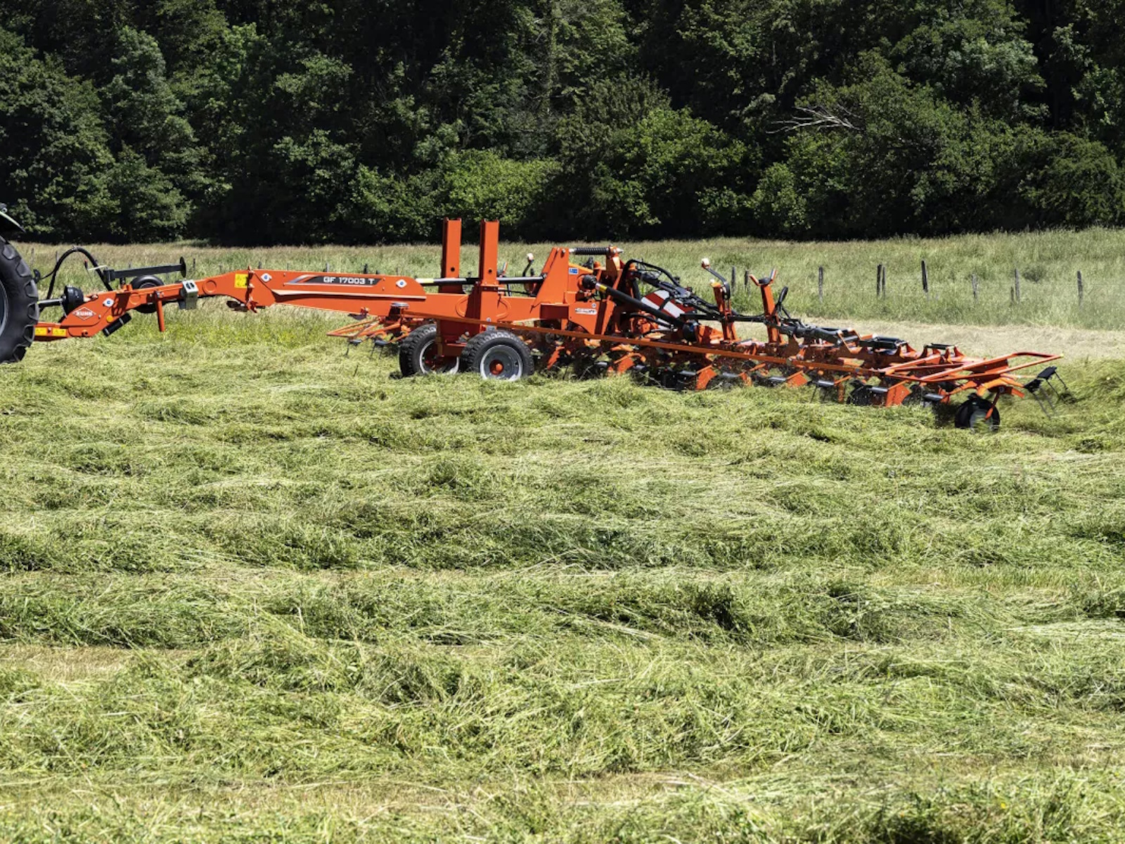 KUHN GF 1003 T Series trailed rotary tedders are ideal for both custom operators and hay producers. These machines provide exceptional tedding quality, resulting in a crop that is fully tedded over the entire width, and is efficiently and uniformly spread to maximize drying. Reduced drying times result in higher quality and nutritional value in hay and haylage.